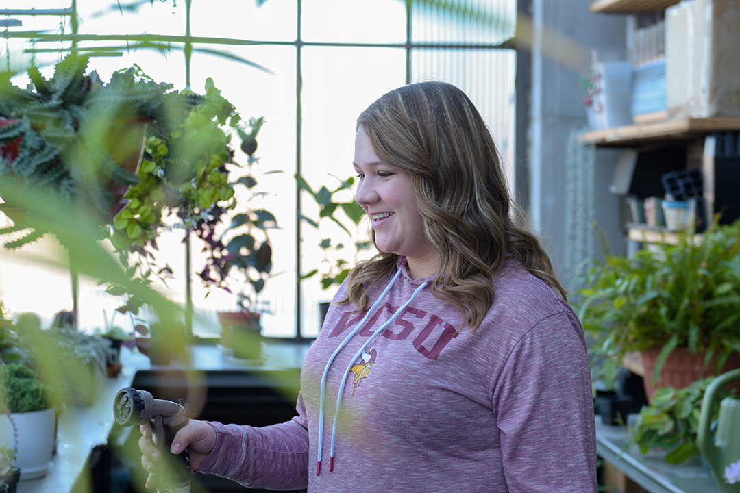Amber Kologi is a dual science major focusing in the areas of Biology and Fisheries & Wildlife. The sophomore, who calls Rochert, Minn. home, gets to spend time in her happy place as student worker in the VCSU Greenhouse.